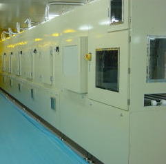 本装置は、各コンベアーより入口コンベアーに投入されたワークを自動的に吊下げ治具に吊下げ、150℃のワーク表面温度で85分間キープしながら、乾燥を行う乾燥炉で乾燥を終了したワークは冷却され、自動的にコンベアー上に降ろされ、L型ラック式受取機に搬送されます。
